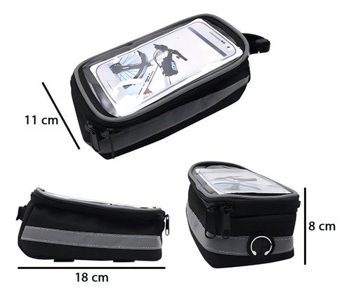 Alforja Bolso Para Bicicleta Porta Celular Impermeable. Este producto está confeccionado en tela cordura, un material resistente y duradero. Cuenta con un acrílico en PVC que permite ver la pantalla y usar el teléfono en forma táctil. Se coloca en la parte frontal de la bicicleta y se sujeta a la estructura por medio de velcros. En la parte interna debajo del teléfono cuenta con un compartimiento ideal para guardar lo que necesites llevar contigo: herramientas, cámaras, parches, llaves, dinero, etc. Incluye un orificio para cable de auriculares, visor PVC touch, tela cordura y un compartimiento / bolsillo lateral. Es resistente a salpicaduras.