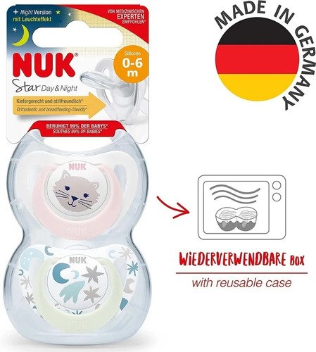 La sustentabilidad es una prioridad para nosotros. Le damos a los padres la oportunidad de reutilizar nuestro estuche en lugar de descartarlo. Por lo tanto, cada chupete NUK viene en una caja resistente y reutilizable, que mantiene el chupete limpio y lo protege, sobre todo para cuando estás fuera y es una solución ideal para evitar que el compañero favorito de tu bebé se ensucie o se moje. Además, es apto para la limpieza higiénica en el microondas.