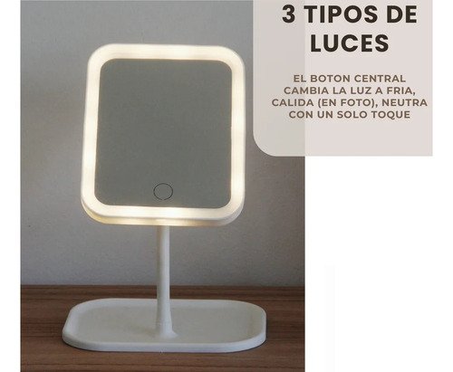 Espejo Maquillaje Con Pie Luz Led Tactil Plegable Usb Marco Blanco