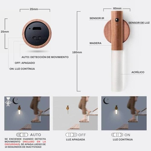 Lampara Pared Mesita Linterna Led Sensor Movimiento Usb Imán