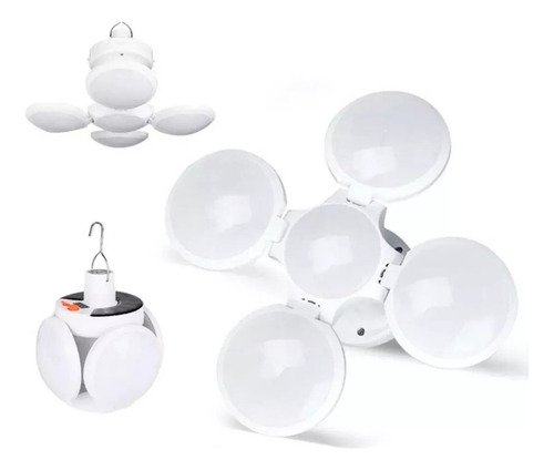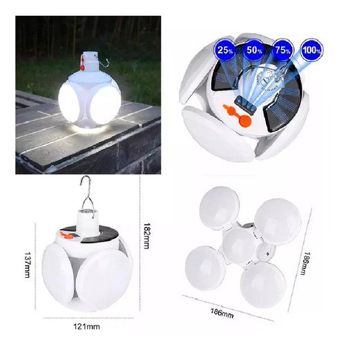 Ideal para transportarla a cualquier lugar, Puedes recargarse a través de sus pequeñas celdas solares como también directamente a la corriente. Bajo consumo de energía, alto brillo, rendimiento estable. Su estado máximo de iluminación entrega hasta 30w y puedes cubrir hasta 80MT Hay dos modos de iluminación para los interruptores de encendido/apagado: luz fuerte y luz débil. La batería de litio recargable integrada se carga automáticamente cuando está conectada al enchufe USB. Ligero, compacto y duradero. Equipado con ganchos de acero inoxidable, fácil de colgar y transportar. Producto ideal para la iluminación de emergencia, en el camping al aire libre, la pesca por la noche, la terraza o cualquier otro lugar donde no tengas energía eléctrica.