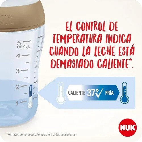 Pero, ¿qué sería de esta tetina perfecta, que está clasificada y recomendada por las madres, parteras y pediatras, sin la mamadera adecuada? La mamadera NUK Nature Sense está hecha de polipropileno de alta calidad, es resistente al desgaste y no contiene BPA. Su cuello extra-ancho hace que el llenado y la limpieza sean muy sencillos. La tapa protectora cierra todos los orificios pequeños evitando posibles goteos.