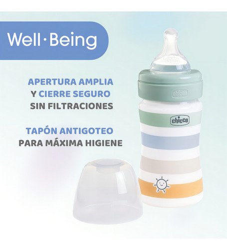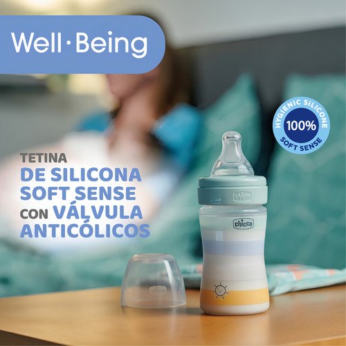 El biberón Chicco WELL-BEING está compuesto por una botella de plástico de 330 ml y permite alimentar al bebé de forma natural con su tetina especial anti-cólicos Physio. Disponible en varios colores y flujos de la tetina diferentes, este biberón Chicco WELL-BEING tiene una forma ergonómica para facilitar el momento de la alimentación. El biberón WELL-BEING protege contra los cólicos y las regurgitaciones, gracias a la tetina Physio intercambiable, cuyo práctico tapón antigoteo lo hace práctico de usar y asegura una higiene óptima. Fácil de limpiar y rápido de llenar por su boca ancha. El cierre seguro evita cualquier tipo de fuga y su forma ergonómica lo hace práctico de usar.