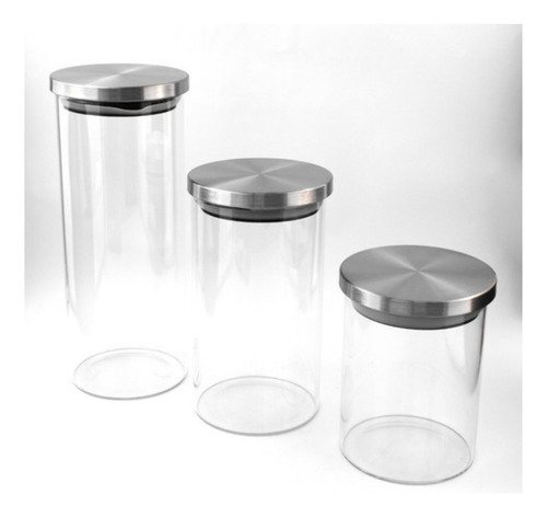 Set de tres elegantes frascos de vidrio con tapa metálica, que combinan funcionalidad y estilo en tu cocina.