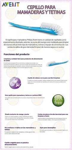 El cepillo para mamaderas Philips Avent tiene un cabezal de cepillado curvo especialmente diseñado, además, la punta del mango está moldeada para limpiar de manera eficaz todo tipo de mamaderas, tetinas y equipo de alimentación. Las cerdas durables de gran densidad limpian de manera segura sin arañar.