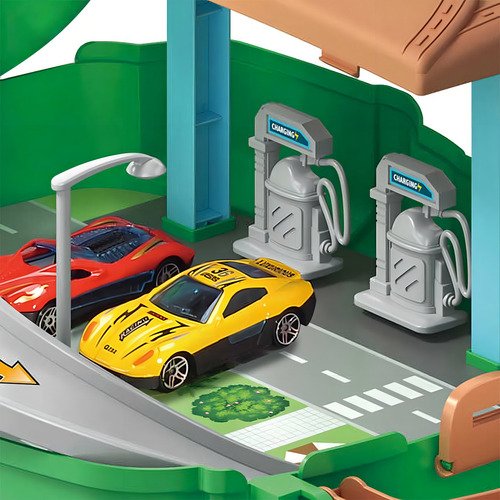 2. La mochila no solo facilita el transporte y almacenamiento, sino que también sirve como soporte para la base autopista donde juegan los niños.