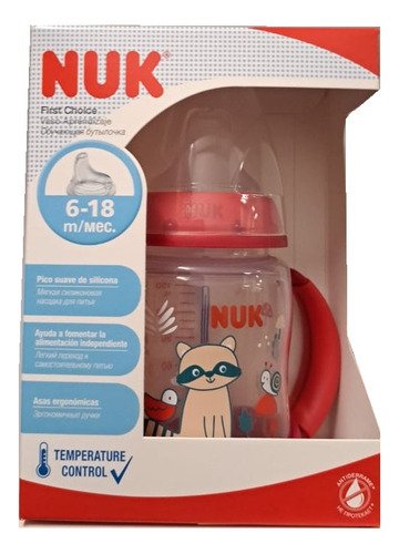 Cuando un bebé se convierte en un niño pequeño, el vaso Aprendizaje NUK First Choice ayuda a garantizar una transición a la alimentación independiente, sin problemas. El vaso Aprendizaje NUK First Choice tiene un pico de silicona que es suave y a prueba de derrames. El sistema NUK anticólicos integrado en el pico, iguala la presión en la botella y ayuda a reducir los cólicos ya que se ingiere menos aire.